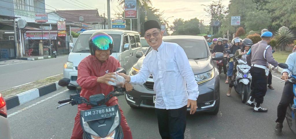 Ketua PWI Riau Raja Isyam memberikan takjil kepada pengendara motor ( ist)